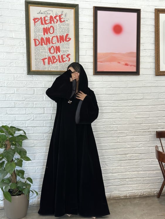 • خامة فاخرة: المخمل الواقف يعطي العباية هيكلًا أنيقًا وثباتًا مثاليًا